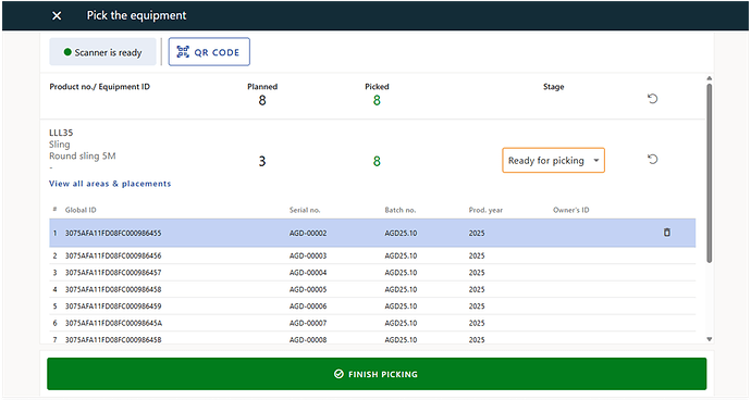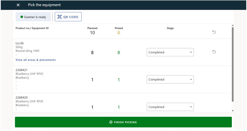 - Start scanning. Scanned equipment is automatically identified and sorted into the relevant request.