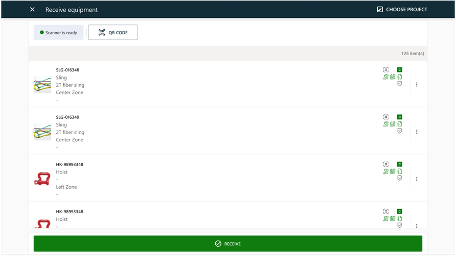Scan to receive unique equipment of a project.