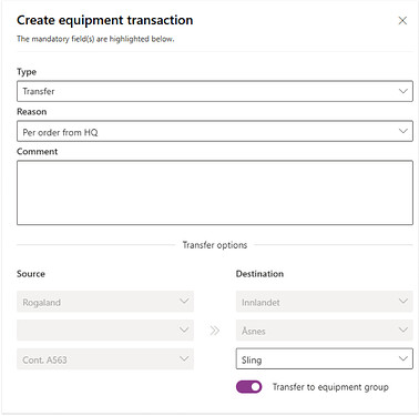 You can move equipment between groups by editing its details or creating a transfer transaction. If the destination group applies its location and area to all equipment, this information updates accordingly.